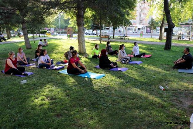 Kayseri'de anne adayı 20 kadına, koronavirüs tedbirleri kapsamında parkta yoga ve meditasyon eğitimi verildi.