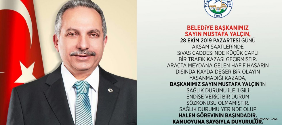 Talas Belediyesi’nin resmi sosyal medya hesabından paylaşılan açıklamada, “Belediye Başkanımız Sayın Mustafa Yalçın, 28 Ekim 2019 Pazartesi günü akşam saatlerinde Sivas Caddesi’nde küçük çaplı bir trafik kazası geçirmiştir. Araçta meydana gelen hafif hasarın dışında kayda değer bir olayın yaşanmadığı kazada, başkanımız sayın Mustafa Yalçın’ın sağlık durumu ile ilgili endişe verici bir durum söz konusu olmamıştır. Sağlık durumu yerinde olup, halen görevinin başındadır. Kamuoyuna saygıya duyurulur” ifadelerine yer verildi.