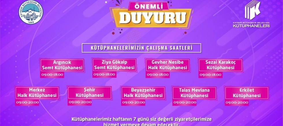 Merkez Halk Kütüphanesi, Şehir Kütüphanesi, Beyazşehir Halk Kütüphanesi, Talas Mevlana Kütüphanesi ve Erkilet Kütüphanesi de 09.00-20.00 saatleri arasında açık olacak.