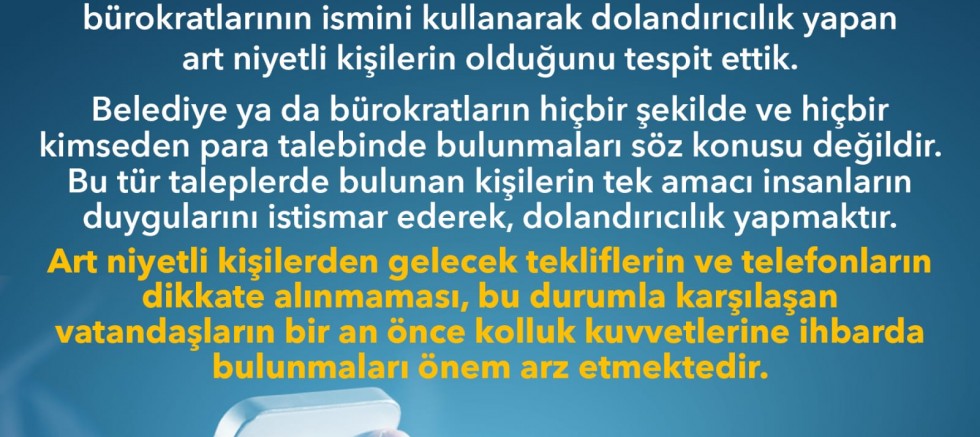 Vatandaşların bu konuda duyarlı olmalarının vurgulandığı açıklamada, belediye ya da bürokratların hiçbir şekilde ve hiçbir kimseden para talebinde bulunmalarının söz konusu olamayacağı ifade edilerek, bu tür taleplerde bulunan kişilerin tek amacının, insanların duygularını istismar ederek dolandırıcılık yapmak olduğu kaydedildi.
