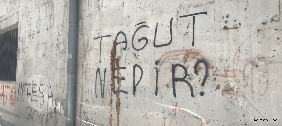Defterdarlık Binası’nın arkasındaki duvarlarda ‘Tağut Nedir?’ yazısı dikkat çekti. Kayseri’nin en işlek cadde ve sokaklarında görülen ‘Tağut nedir?’ yazısının IŞİD'i savunan kişilerce yazıldığı iddia edildi.