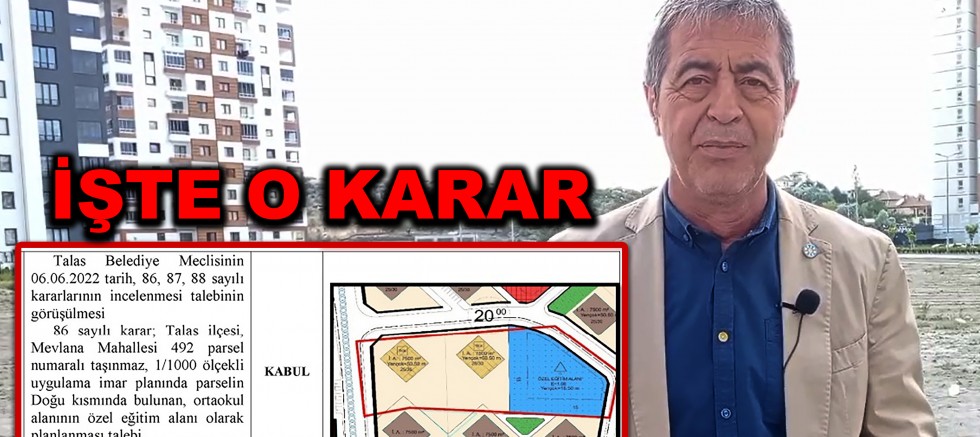 İyi Partili Kazım Yücel bu sefer ilgili alana giderek açıklama yaparak konuya ilişkin tepkisini dile getirdi. Yücel: Talas İlçesi Mevlana Mahallesi 25-30 yıl önce planlanmış ve 80 bine yakın bir nüfus burada yaşamaktadır. Vatandaşlarımız tamda devlet okuluna kavuşacağı zaman Büyükşehir Belediyesinin 18 Temmuz tarihli meclis toplantısında (Talas Belediye Meclisinde 06.06.2022 tarih 86 sayılı karar Talas İlçesi, Mevlana Mahallesi 492 parsel numaralı taşınmaz, 1/1000 ölçekli uygulama imar planında parselin Doğu kısmında bulunan ortaokul alanının özel eğitim alanı olarak planlanması talebi.) devlet ortaokulunu özel eğitim alanına dönüştürülmesi ile ilgili teklifi ile gelindi. Biz Belediye Meclisinde İyi Parti Grubu olarak ısrarla ve şiddetle karşı çıkarak gerekçelerini de ortaya koymamıza rağmen maalesef ne bir açıklama yapıldı nede bu konunun tartışmaya açılmasına fırsat verildi. Yani 80 bin nüfusun yaşadığı mahallede bir devlet ortaokulunu kaldıracaksınız özel eğitim alanına dönüştüreceksiniz. İfadelerini kullandı.