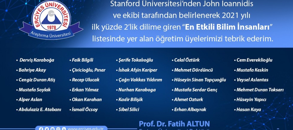 Stanford Üniversitesi’nden John Ioannidis ve ekibi tarafından; yayın sayıları, atıf sayıları, h-indeksi, hm-indeksleri gibi farklı değişkenler kullanılarak oluşturulan ve PLOS Biology dergisinde yayımlanan 2021 yılı ilk yüzde 2’lik dilime giren “En Etkili Bilim İnsanları” listesi açıklandı. Açıklanan listeye göre Erciyes Üniversitesi'nden (ERÜ) 30 öğretim üyesi listeye girdi. ERÜ Rektörü Prof. Dr. Fatih Altun, konu ile yaptığı açıklamada ERÜ’nün her geçen gün yeni başarılara imza atmaya devam ettiğini söyleyerek, “En Etkili Bilim İnsanları” listesine girme başarısı gösteren öğretim üyelerini tebrik etti.