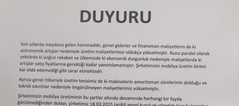 Mobilya sektörü firmalarından biri olan İpek Mobilya, artan maliyetler ve ekonomik durgunluk nedeniyle üretim faaliyetlerini durdurma kararı aldığını açıkladı. Yapılan açıklamada; “Son yıllarda meydana gelen hammadde, genel giderler ve finansman maliyetlerindeki astronomik artışlar nedeniyle üretim maliyetlerimiz oldukça yükselmiştir. Buna paralel olarak sektördeki yoğun rekabet ve ülkemizdeki ekonomik durgunluk nedeniyle maliyetlerdeki artışlar satış fiyatlarına gerektiği kadar yansıtılamamıştır. Şirketimizin mobilya üretim birimi kâr elde edemediği gibi zarar etmektedir. Ayrıca genel itibariyle üretim tesisimizdeki makinelerin amortisman sürelerinin dolduğu ve teknik sıkıntılar nedeniyle öngörülemeyen maliyetlerimiz yükselmiştir. Şirketimizin mobilya üretiminin bu şartlar altında devamında herhangi bir fayda görülmediğinden dolayı, şirketimiz 18.03.2025 tarihli genel kurul ve yönetim kurulu kararları gereği 26.04.2025 tarihinde şirketimizin mobilya üretim birimleri kapatılacak ve tüm çalışanların iş akitleri ilgili tüm resmi kurumlara bildirimde bulunarak yasal prosedürler kapsamında fesih edilecektir” ifadeleri kullanıldı.