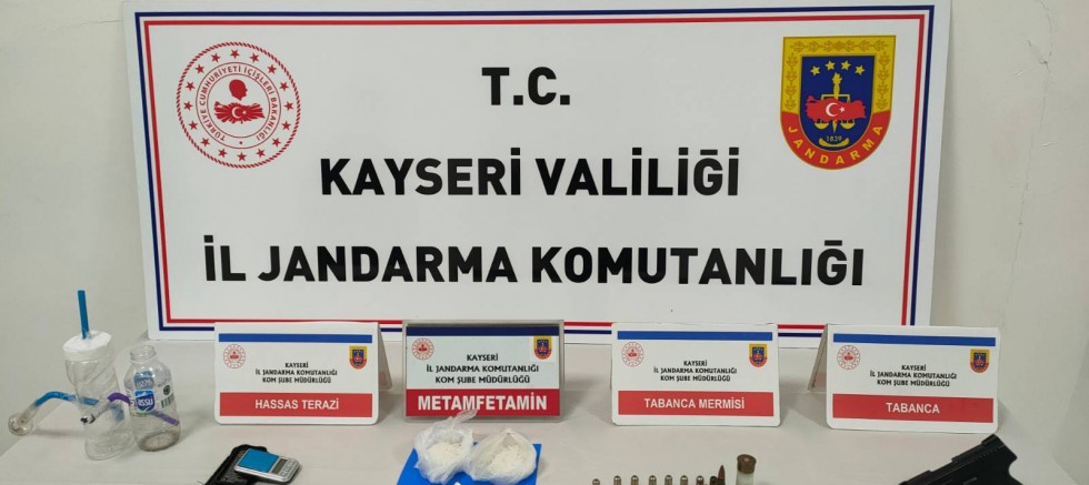 Kayseri İl Jandarma Komutanlığı Suç Araştırma Kısım Amirliği (JASAT), Bünyan İlçe Jandarma Komutanlığı ve KOM Şube Müdürlüğü ekipleri aranan şahısların yakalanmasına yönelik çalışma gerçekleştirdi. Bu kapsamda; yakalanan M.A. isimli şahsın bulunduğu Bünyan İlçesi Fatih Mahallesindeki evde ve evde misafir olarak bulunan B.C. adına kayıtlı 27 plakalı otomobilde arama yapıldı. Yapılan aramalar neticesinde yaklaşık 80 gram metamfetamin, 1 adet hassas terazi, 4 adet uyuşturucu kullanma aparatı, 2 adet tabanca, 5 adet tabanca fişeği, 1 adet av tüfeği fişeği, 1 adet piyade tüfeği fişeği ve 9 adet kurusıkı tabanca fişeği ele geçirildi. Otomobilde yapılan aramalarda herhangi bir suç unsuruna rastlanmadı. Şüpheliler gözaltına alınarak haklarında gerekli yasal işlemler başlatıldı.