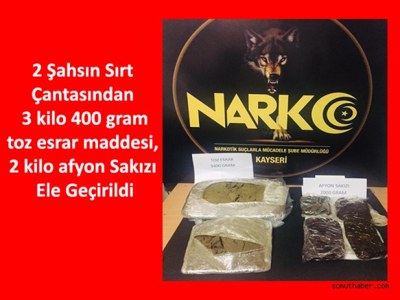 Ankara istikametine giderken yolcu otobüsü polis ekiplerince durdurularak yapılan aramalarda Afgan Uyruklu A.J ve A.B isimli iki şahsın sırt çantalarında 3 kilo 400 gram toz esrar maddesi, 2 kilo afyon Sakız’ı maddesi ele geçirildi.