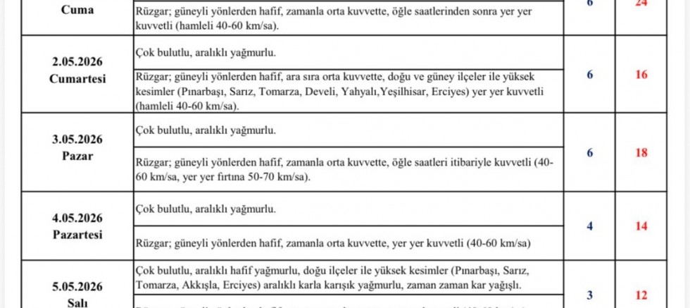 Yapılan değerlendirmelere göre bugün kent genelinde parçalı bulutlu bir hava beklenirken, öğle saatlerinden sonra özellikle Yahyalı, Develi, Yeşilhisar ve Erciyes çevresinde aralıklı sağanak ve yer yer gök gürültülü sağanak yağış görülecek. Hafta sonu itibarıyla çok bulutlu bir hava hakim olacak, aralıklı yağmur geçişleri yaşanacak. Yüksek kesimlerde ise yer yer karla karışık yağmur ve zaman zaman kar yağışı bekleniyor. Rüzgarın güneyli yönlerden hafif ve zamanla orta kuvvette eseceği, öğle saatlerinden itibaren yer yer kuvvetli hamleler şeklinde 40 ila 60 kilometre hıza ulaşabileceği tahmin ediliyor. Bazı bölgelerde kısa süreli fırtına şeklinde 50 ila 70 kilometre hızlara çıkabileceği bildirildi. Mevsim normallerinin üzerinde seyreden hava sıcaklıklarının 2 Mayıs Cumartesi gününden itibaren azalarak mevsim normalleri civarına düşmesi öngörülüyor. Kent merkezinde hafta boyunca en düşük sıcaklıkların 3 ila 6 derece, en yüksek sıcaklıkların ise 12 ila 24 derece arasında değişmesi bekleniyor.