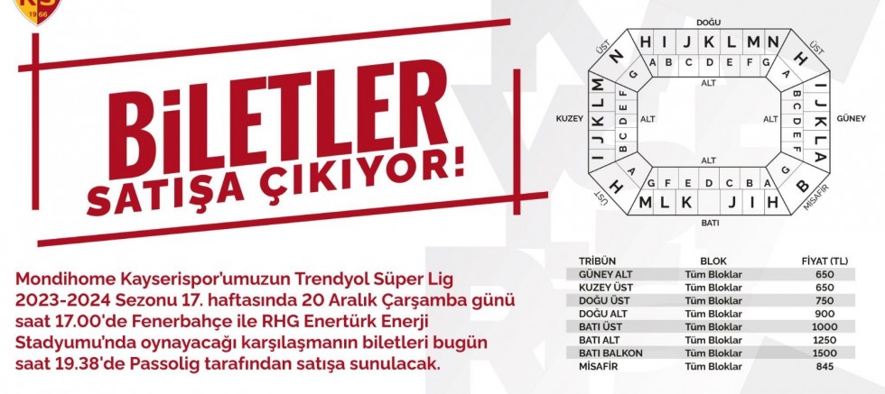 Kulüp tarafından yapılan açıklamada, “Kayserisporumuzun Süper Lig 2023 – 2024 Sezonu 17’inci haftasında 20 Aralık Çarşamba günü saat 17.00’da Fenerbahçe ile RHG Enertürk Enerji Stadyumunda oynayacağı karşılaşmanın biletleri saat 19.38 Passolig tarafından satışa sunulacaktır” ifadelerine yer verildi.