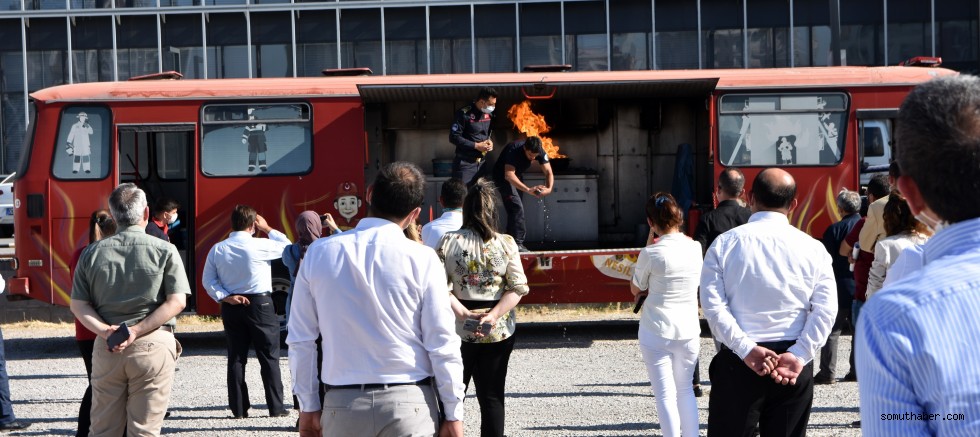 Tatbikat, KTO Otoparkında hazır bekletilen içerisinde ocak, televizyon ve elektrik panosunda çıkan yangınların gösterildiği otobüste devam etti. İtfaiye Amiri Fatih Çukurlu bir evin içerisinde yangına sebep olacak unsurların yer aldığı otobüste uygulamalı olarak yangına müdahaleyi gösterdi. Oda çalışanlarından gönüllü olanlar yanan ocaktaki tavayı söndürdü.