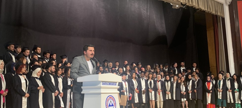 Erciyes Üniversitesi Mimarlık Fakültesi mezuniyet töreninde konuşan ER: “Bugünden itibaren hepiniz mimarlık fakültesi diplomasına sahip birer birey olarak topluma katılacaksınız. Üniversite eğitiminiz sonucundaki kariyer yolculuğunuzda başarılı olmak için gerekli birçok bilgiye sahipsiniz. Ancak “mimarlık” mesleği hiçbir zaman “ben oldum” denilebilecek bir meslek grubu değildir. Dolayısıyla bugün sadece lisans eğitiminiz tamamlanıyor ancak sizler mimarlık adına öğrenmeye ve yetkinlik kazanmaya devam edeceksiniz. Devam edecek olan bu öğrenme sürecinde okuldan size kalan en önemli olgu mesleğimizin ilkeleri ve etik değerleridir.
