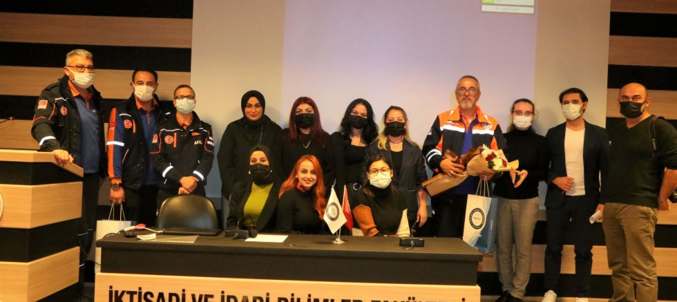 NNYÜ İktisadi ve İdari Bilimler Fakültesi Konferans Salonunda Siyaset Bilimi ve Kamu Yönetimi Bölümünün Gönüllülük Çalışmaları dersi kapsamında gerçekleştirilen eğitim programına katılan AFAD Şube Müdürü Hasan Say deprem, heyelan, sel, çığ ve yangın gibi afetler çerçevesinde, afet öncesinde, afet sırasında ve afet sonrasında yapılması gerekenler hakkında bilgiler verdi.