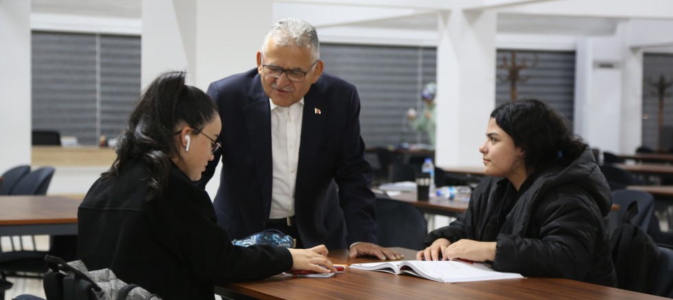 Kayseri Büyükşehir Belediye Başkanı Dr. Memduh Büyükkılıç, Erkilet Kütüphanesi’ni ziyaret ederek, öğrencileri kütüphane girişinde ‘hoş geldiniz’ diyerek karşıladı. Başkan Büyükkılıç, kütüphaneyi gezerek, ders çalışan gençlerin tek tek taleplerini dinledi.