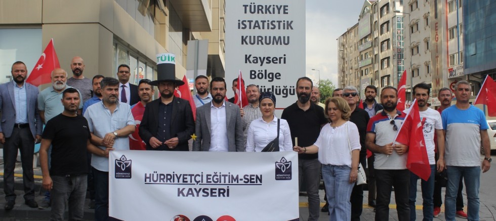 Türkiye İstatistik Kurumu (TÜİK) enflasyon oranı aylık yüzde 2,98, yıllık ise yüzde 73,50 olarak açıkladı. Hürriyetçi Eğitim Sen Kayseri Şubesi üyeleri ise TÜİK Kayseri Bölge Müdürlüğü önünde açıklama yaptı. TÜİK tarafından açıklanan enflasyon rakamının düşük olduğunu savunan İl Temsilcisi Hakan Coşkunsu, TÜİK ile bazı akademisyenlerden oluşan bağımsız araştırma gruplarının enflasyon rakamlarının birbirini hiç tutmadığını söyledi. Memur ve emekliye verilecek enflasyon farkının düşük tutulması için enflasyonun bilerek düşük gösterildiğini iddia eden Coşkunsu, “Bize sunulan enflasyon ile gerçekte maruz kaldığımız enflasyon arasında dağlar kadar fark var. Ne hikmetse Temmuz ayında alacağımız, anamızın ak sütü gibi helal olan, enflasyon farkı yaklaştıkça TÜİK; nasıl olur da memur ve emekli daha az zam alır, bunun derdinde ve bir yerde hata var. Kamu çalışanı ve emekli, elinde kağıt, kalem, hesap makinesi sürekli hesap yapıyor. Ay sonunu getirmenin gayretinde, işine odaklanamıyor. Bu karışıklığın ve tutarsızlığın bedelini kamu çalışanları ve emekliler olarak nedense hep bizler ödüyoruz. Zaten geçinemeyen, ekonomik darboğazda olan eğitim çalışanları gerçekte maruz kaldığı enflasyon oranlarının 6 aylık süre sonunda maaşlarına yansımasını beklerken üstüne bir de bu karmaşanın, hesap farklılıklarının altında ezilmektedir. Yakıt fiyatları malumunuz. 3-5 kilometre mesafede çalıştığı okuluna ulaşmak isteyen öğretmenler adeta kontak çevirmeye korkuyor. Tabi ki buna benzer birçok örnek verilebilir. Hal böyleyken; takibini yaparken, rakamları telaffuz ederken zorlandığımız zamların enflasyon oranlarına da yansıtılırken farklı bir yöntemle daha adil yansıtılmasını talep ediyoruz. Son 1 yıllık zam oranlarını ve TÜİK’e göre çıkan sonucu sizlere hatırlatmak istiyoruz” diye konuştu.