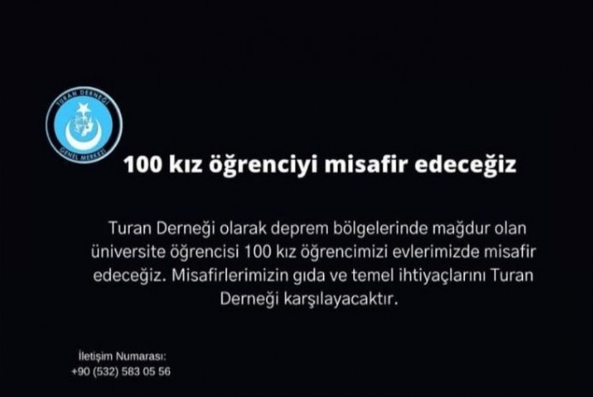 Kahramanmaraş’ın Pazarcık ve Elbistan ilçelerinde meydana gelen 7,7 ve 7,6 büyüklüğündeki deprem sonrası 10 ilde yıkım yaşandı. Barınma ihtiyacının da ön plana çıkmasıyla, Turan Derneği tarafından deprem bölgelerinde olan üniversite öğrencisi 100 kız öğrenciyi evlerde masrafları karşılanarak misafir edileceği açıklandı.