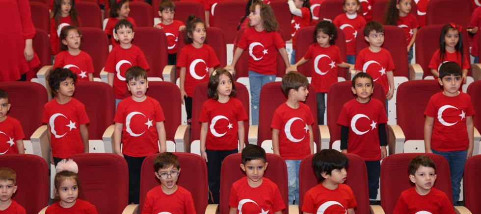 Ay yıldızlı tişörtler giyen minik yüreklerin oluşturduğu dev koro ile katılımcılar, Müzik Öğretmeni Hakan Koçer’in seslendirdiği parçalara eşlik ederek, Cumhuriyet Bayramı coşkusunu doyasıya yaşadı.