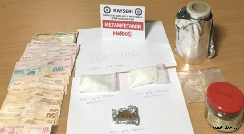 4 Eylül’de Kayseri İl Emniyet Müdürlüğü Narkotik Suçlarla Mücadele Şubesi ekiplerinin yaptığı operasyonda karı, koca olan M.Ç. ve Z.Ç. isimli şahısları Kocasinan ilçesine bağlı olan Talas Yenidoğan mahallesindeki evde yakaladı. Evde yapılan aramada, 71 gram metamfetamin, 0,6 gram esrar, 2 alüminyumfolyo, 3 gram bonzai ve uyuşturucu ticaretinden elde ettikleri öğrenilen para ele geçirildi. Gözaltına alınan M.Ç. ve Z.Ç. isimli şüpheliler çıkarıldıkları mahkeme tarafından 'uyuşturucu madde ticareti yapma' suçundan tutuklandılar.
